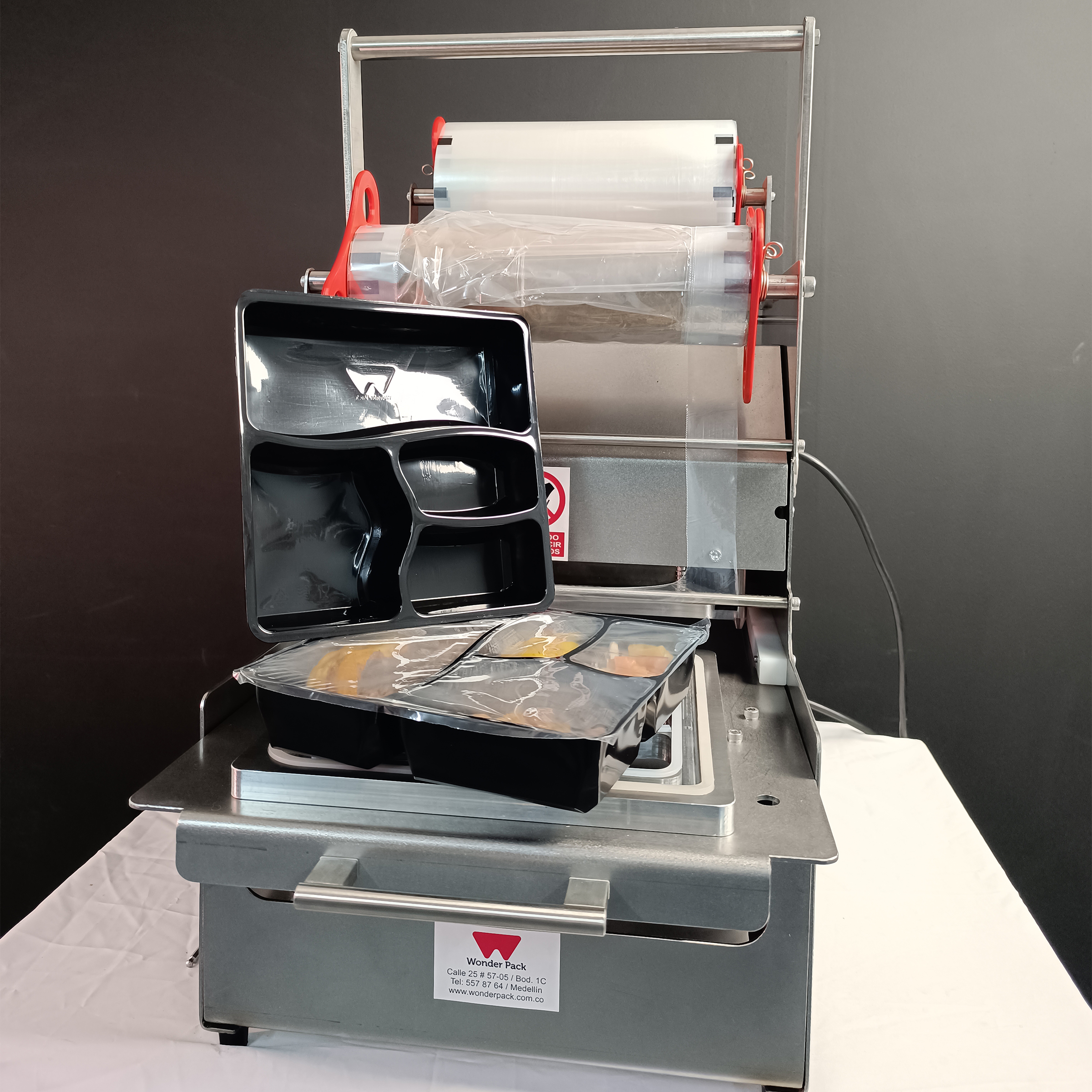 Medidas: Largo: 43 cm Ancho: 37 cm Alto: 68 cm Peso Neto: 35 Kg Peso Bruto: 38 Kg Conexión eléctrica: 110 V – 60 Hz Operación de la máquina: manual Tiempo de sellado: 6-10 segundos por unidad Capacidad de sellado por hora: minimo 500 unidades Capacidad Bandeja con 4 divisiones Bandejas de 22 cm x 22 cm medidas intermas Uso para almuerzos con contenido para 12 onzas sopas, snacks u otros Empaque suministrado por Wonder Pack.